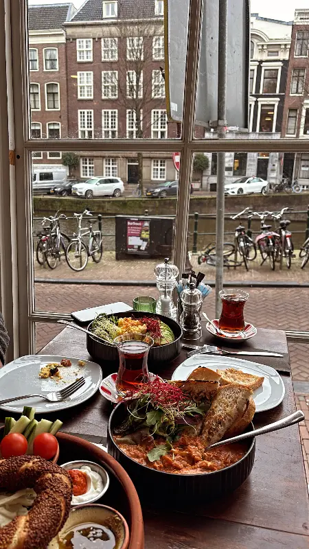문을 열자 따뜻한 미소로 맞이해주는 직원들 덕분에 기분 좋게 자리에 앉았다. 창밖으로는 암스테르담 특유의 운하와 아기자기한 건물들이 한눈에 들어온다. 고풍스러운 건물들을 배경으로 여유롭게 지나다니는 자전거들의 모습은 마치 그림엽서 같았다. 테이블 위에는 이미 터키식 홍차를 위한 찻잔과 설탕, 향신료 등이 정갈하게 놓여 있었다. 붉은색 튤립 문양이 그려진 찻잔이 햇빛을 받아 은은하게 빛나고 있었다.