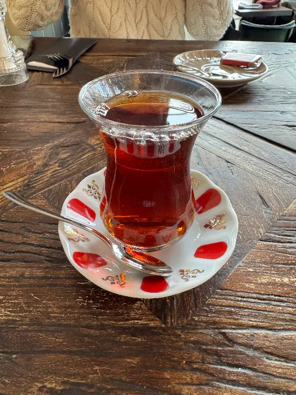터키식 차는 섬세하게 디자인된 튤립 모양의 잔에 담겨 나온다. 붉은 빛깔의 차는 향긋한 향을 풍기며 입맛을 돋운다.