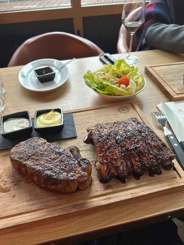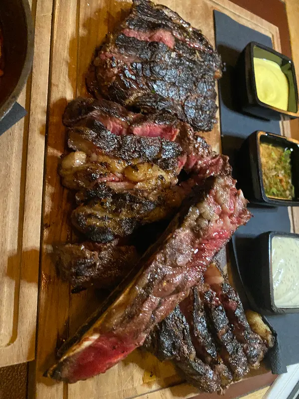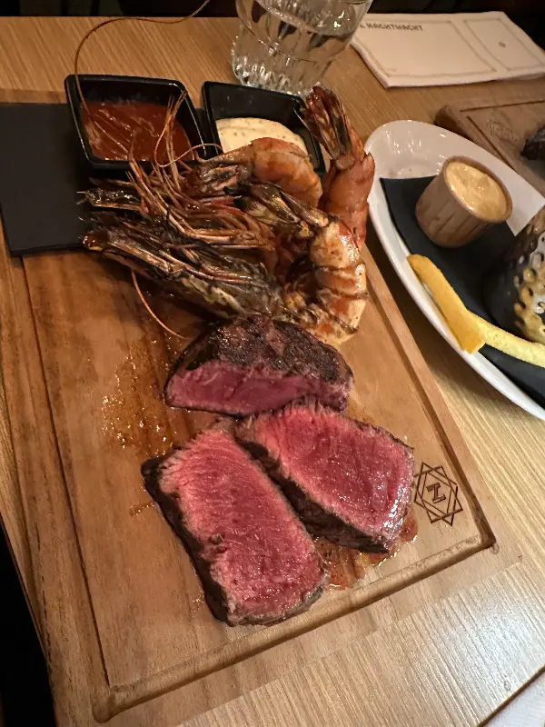 드디어 기다리고 기다리던 스테이크가 등장했다. 우리는 스테이크 타르타르, 서프 앤 터프, 립 앤 스테이크 콤보를 주문했다. 스테이크 타르타르는 신선한 육회의 부드러움과 고소함이 완벽하게 어우러진 요리였다. 입안에서 사르르 녹는 듯한 식감은 잊을 수 없는 경험이었다. 서프 앤 터프는 스테이크와 새우의 조합으로, 육해공의 풍미를 동시에 느낄 수 있는 메뉴였다. 육즙 가득한 스테이크와 탱글탱글한 새우의 조화는 환상적이었다. 특히 립 앤 스테이크 콤보는 푸짐한 양과 다양한 맛을 즐길 수 있는 메뉴였다. 부드러운 립과 육즙 가득한 스테이크는 모두 훌륭했다. 굽기 정도도 완벽했고, 곁들여 나온 소스들과의 조화도 훌륭했다.