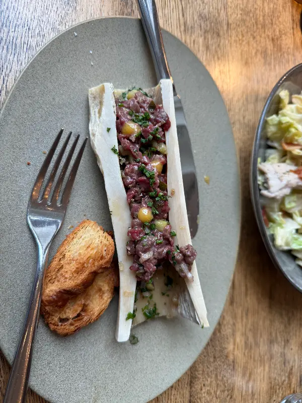 스테이크 타르타르는 맛보다는 보기 좋게 담아내는 데 더 신경을 쓴 듯해서 아쉬웠다는 의견도 있었지만, 전반적으로 음식의 플레이팅은 아름다웠고, 재료도 신선했습니다. 특히 뼈 속에 담겨 나오는 스테이크 타르타르의 독특한 플레이팅은 시각적인 즐거움까지 더했습니다.