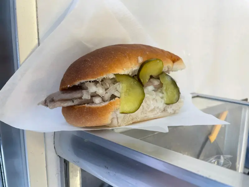 쇼케이스 안에는 윤기가 흐르는 청어가 가지런히 놓여 있었고, 싱싱한 피클과 양파가 그 옆을 장식하고 있었습니다. 사진에서 보았던 바로 그 모습. 드디어 하링을 맛볼 수 있다는 생각에 가슴이 두근거렸습니다.
