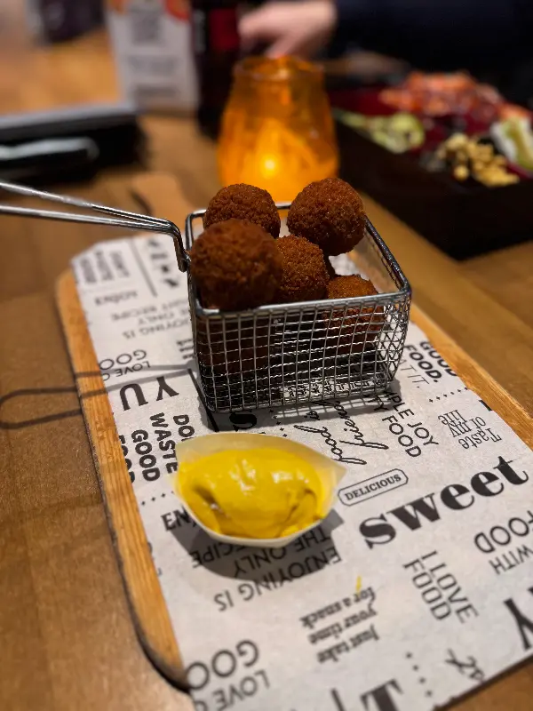 겉은 바삭, 속은 촉촉한 네덜란드식 고기 완자 ‘비터발렌’. 머스타드 소스에 찍어 먹으면 환상적인 맛을 자랑한다.