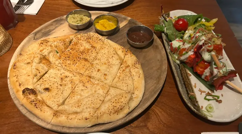 음식은 정말 맛있었습니다✨ 특히 마늘 난은 잊을 수 없는 맛이었습니다. 겉은 바삭하고 속은 촉촉한 난은, 마늘의 향긋함과 버터의 풍미가 완벽하게 어우러져 있었습니다. 찢어지는 소리마저 황홀하게 느껴지는 마늘 난은, 다른 요리들과 함께 먹으니 그 맛이 배가되었습니다.