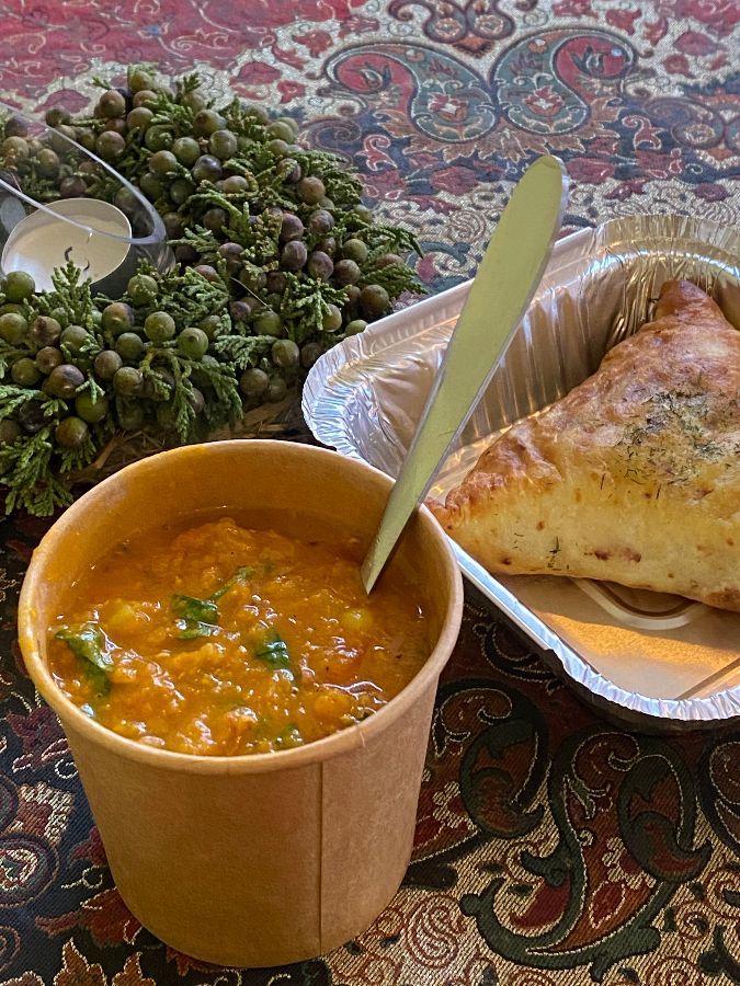 수프와 함께 제공되는 빵 또한 특별하다. 사진 속 빵은 겉은 바삭하고 속은 촉촉한 완벽한 조화를 이루고 있다. 렌틸콩 수프와 함께 곁들이면, 그 풍미가 더욱 깊어진다. 이국적인 문양이 새겨진 식탁보는 헬스 코너만의 독특한 분위기를 더하며, 마치 페르시아의 어느 가정집에 초대받은 듯한 느낌을 선사한다. 테이블 한켠에 놓인 초록빛 식물 장식은 공간에 생기를 불어넣어, 편안하고 아늑한 분위기를 완성한다.