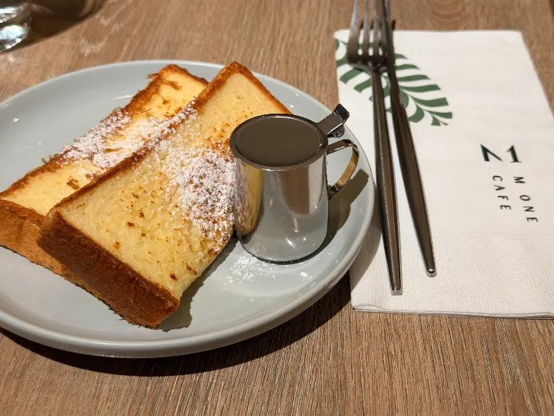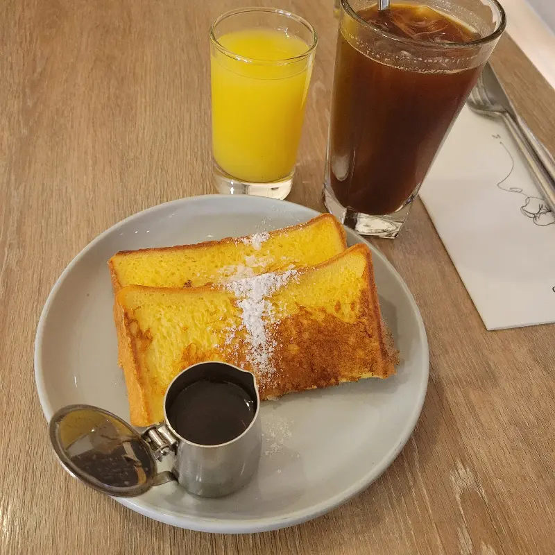 프렌치 토스트. 부드러운 빵과 달콤한 시럽의 조화가 완벽합니다.