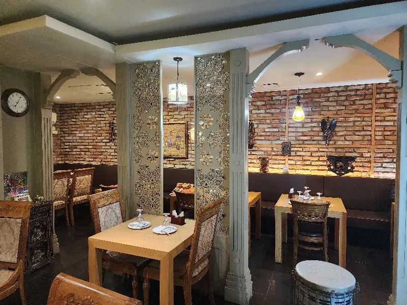 벽에는 인도를 상징하는 그림들이 걸려 있고, 테이블은 화려한 문양으로 장식되어 있어 보는 재미를 더한다. 이미지 속 테이블과 의자는 나무 소재로 만들어져 따뜻하고 편안한 느낌을 준다.