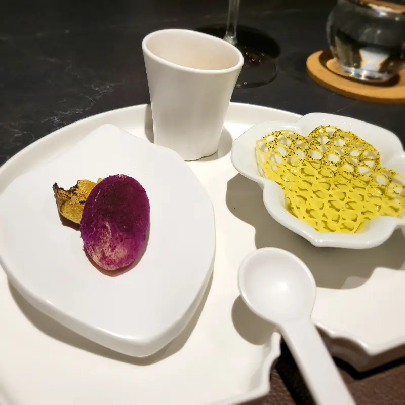 사진에서 볼 수 있듯이, 보라색과 노란색의 강렬한 색상 대비는 시선을 사로잡았고, 정갈하게 담긴 모습은 맛에 대한 궁금증을 자아냈다. 앙증맞은 크기의 요리들은 입안에서 다채로운 풍미를 선사하며, 다음 요리에 대한 기대감을 높였다. 마치 미지의 세계를 탐험하는 듯한 즐거움이 느껴졌다.