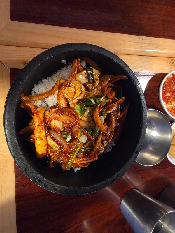 고민 끝에 주문한 메뉴는 바로 오징어 돌솥비빔밥. 뜨겁게 달궈진 돌솥 안에서 지글거리는 소리와 함께 매콤한 향이 코를 자극했습니다. 젓가락으로 쓱쓱 비벼 한 입 맛보니, 쫄깃한 오징어와 아삭한 야채, 고소한 김 가루가 어우러져 환상적인 맛을 선사했습니다.
