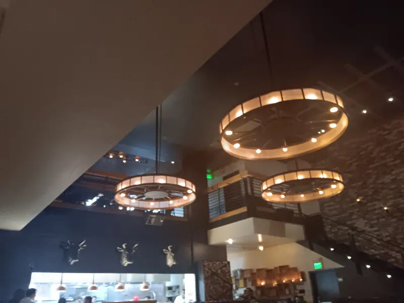 높은 천장에 매달린 링 모양의 조명이 독특한 분위기를 자아냅니다.