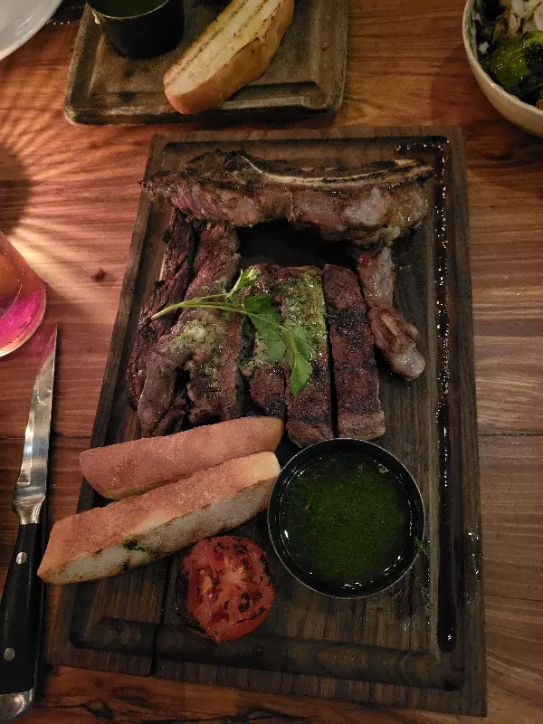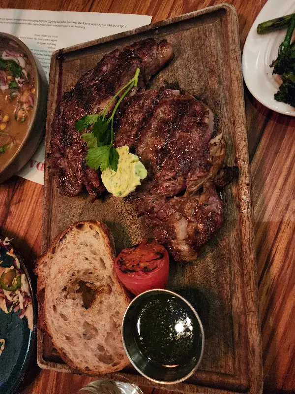 두 명이서 아사도 믹스를 주문했는데, 아사도와 스테이크의 양이 조금 부족하게 느껴졌지만, 전체적으로는 만족스러웠습니다. 립아이 스테이크는 롤린다에서 꼭 맛봐야 할 메뉴 중 하나입니다. 풍부한 마블링과 부드러운 식감은 입안에서 살살 녹는 듯한 황홀한 경험을 선사합니다. 함께 제공되는 치즈빵 또한 훌륭한 조화를 이루며 스테이크의 풍미를 더욱 돋보이게 합니다.