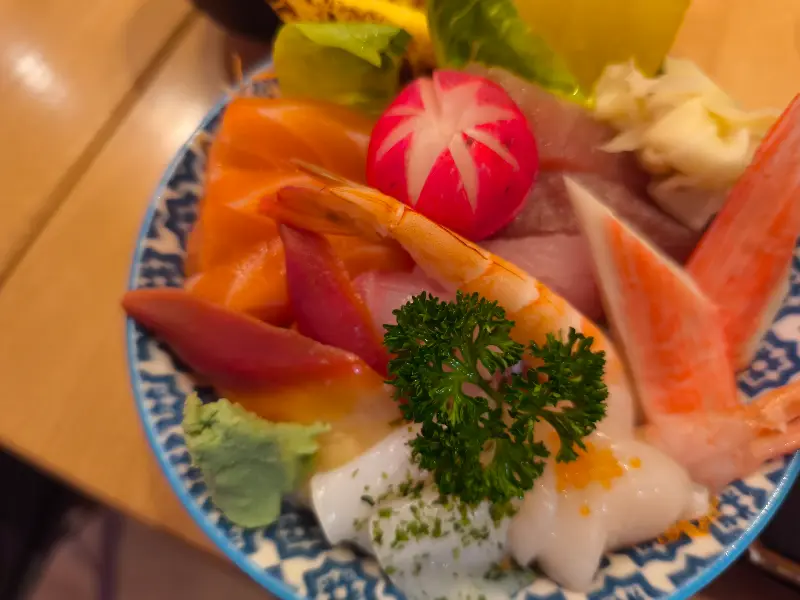 사진에서 보이는 것처럼, 윤기가 흐르는 신선한 사시미는 입안에서 살살 녹는 듯한 식감을 자랑한다. 연어, 참치, 새우 등 다양한 종류의 사시미를 한 번에 맛볼 수 있다는 점도 매력적이다. 특히, 와사비를 살짝 올려 간장에 찍어 먹으면, 풍미가 더욱 살아난다.