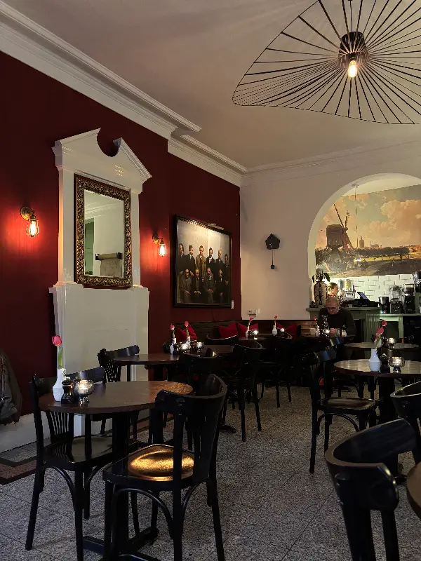 문을 열고 들어선 Greenwoods는 기대 이상의 공간이었다. 붉은 벽돌과 고풍스러운 가구, 은은하게 빛나는 조명이 아늑한 분위기를 자아냈다. 마치 오래된 유럽 영화 속 한 장면에 들어온 듯한 기분이었다. 벽에는 그림들이 걸려 있고, 테이블마다 놓인 작은 꽃병이 섬세함을 더했다. 앤티크한 분위기 속에서 브런치를 즐길 생각에 더욱 설렜다. 사진에서 보던 것보다 훨씬 매력적인 공간이었다. 천장의 독특한 조명 디자인도 눈길을 사로잡았다.
