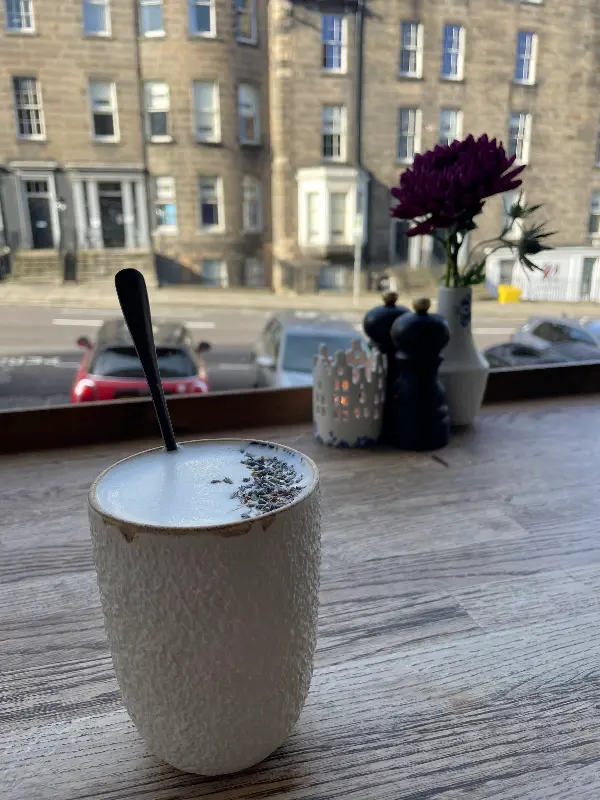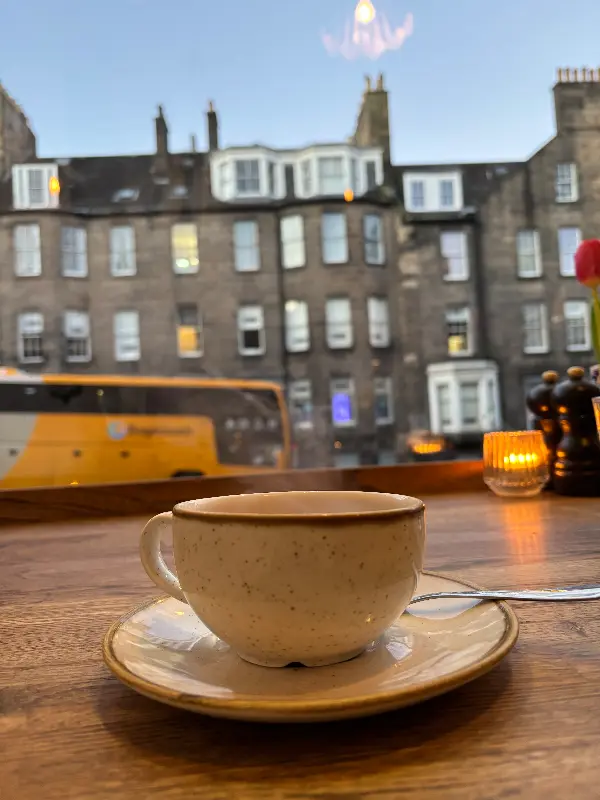 예약을 하지 않았지만, 다행히 15분 정도 기다린 끝에 창가 자리에 앉을 수 있었다. 기다리는 동안 길 건너편 카페에서 커피를 마시며 여유를 즐겼다. 창밖으로는 에든버러의 고풍스러운 건물들이 한눈에 들어왔다. 특히, 찻잔 옆 작은 캔들 덕분에 따뜻하고 아늑한 분위기를 만끽할 수 있었다.