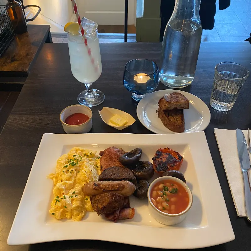 풀 스코티쉬는 블랙 푸딩, 소시지, 베이컨, 구운 토마토, 버섯, 해기스 등 다양한 스코틀랜드 전통 음식들로 구성되어 있었다. 겉은 바삭하고 속은 촉촉한 블랙 푸딩, 육즙 가득한 소시지, 짭짤한 베이컨, 신선한 토마토와 버섯, 그리고 독특한 풍미의 해기스까지, 모든 재료들이 신선하고 맛있었다. 특히, 버섯의 풍미가 인상적이었다. 한 입 베어 물 때마다 입안 가득 퍼지는 풍미는, 에든버러에서의 첫 식사를 더욱 특별하게 만들어 주었다.