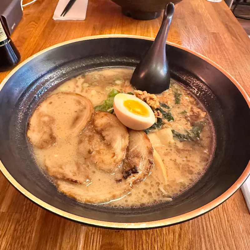 메뉴판을 펼쳐 들고 고민 끝에 선택한 것은 돈코츠 라멘. 뽀얀 국물 위로 윤기가 흐르는 차슈와 반숙 계란이 얹어져 있었다. 먼저 국물부터 한 모금 맛보았다. 깊고 진한 육수의 풍미가 입안 가득 퍼져 나갔다. 돼지 뼈를 오랜 시간 동안 정성껏 우려낸 듯, 묵직하면서도 부드러운 맛이 일품이었다. 느끼함은 전혀 없고, 오히려 깔끔하고 담백했다.