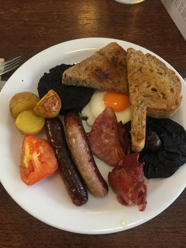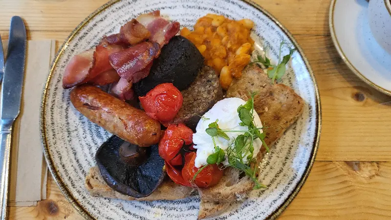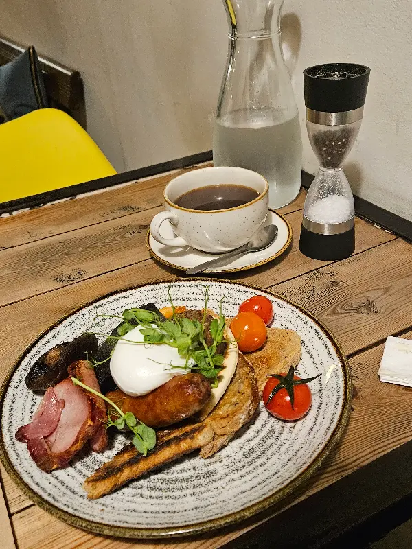 접시 위에는 두툼한 베이컨, 촉촉한 계란, 육즙 가득한 소세지, 그리고 스코틀랜드 전통 음식인 블랙푸딩과 해기스가 놓여 있었습니다. 겉은 바삭하고 속은 촉촉한 구운 토마토도 빼놓을 수 없죠. 특히 한국에서 순대를 즐겨 먹는 저에게 블랙푸딩은 익숙하면서도 새로운 맛이었습니다. 향신료 향이 강하다는 평도 있지만, 제 입맛에는 아주 잘 맞았습니다.