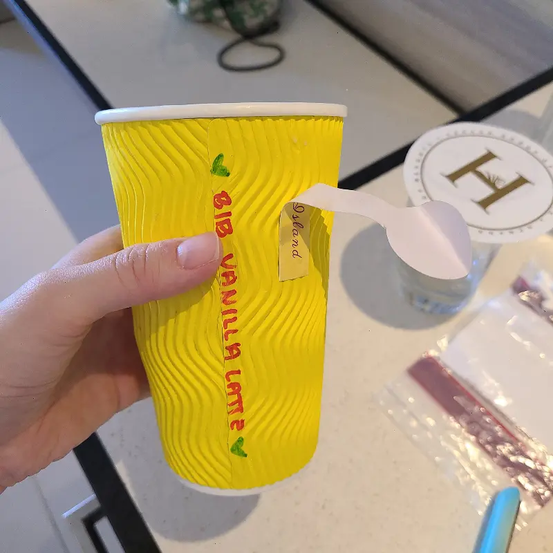 나는 아이스 아메리카노와 바닐라 라떼를 주문했다. 잠시 후, 테이블로 가져다주신 커피는 보기에도 훌륭했다. 아이스 아메리카노는 투명한 유리잔에 담겨 시원함을 더했고, 바닐라 라떼는 노란색 종이컵에 담겨 귀여움을 뽐냈다. 컵에는 ‘BiB VANILLA LATTE’라는 글씨와 함께 작은 그림이 그려져 있었다. Dylan이라는 이름이 적힌 스티커도 붙어있는 걸 보니, 주문 제작 컵인 듯했다. “근처 밥 먹고 들렸어요. 바닐라 라떼 맛있어요!! 사진도 찍었는데 잘 찍어주심”이라는 리뷰처럼, BiB는 맛뿐만 아니라 보는 즐거움도 선사했다.