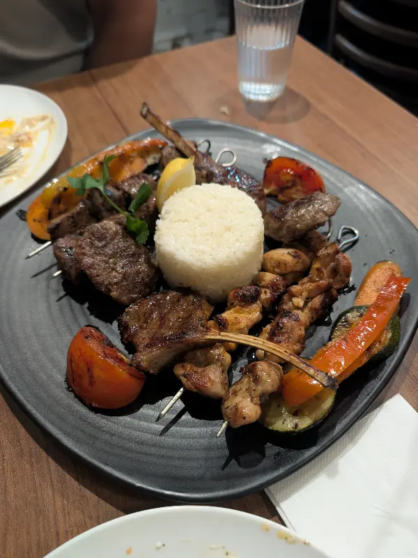 메인 요리인 믹스 그릴 플래터는 Chef Sofra의 대표 메뉴답게, 눈과 입을 즐겁게 하는 화려한 비주얼을 자랑했다. 양갈비, 치킨, 코프타 등 다양한 종류의 고기가 한 접시에 담겨 나왔는데, 모든 고기가 완벽하게 조리되어 입안에서 살살 녹았다. 특히 하이라이트는 단연 양갈비였다. 겉은 바삭하고 속은 촉촉한 완벽한 굽기, 풍부한 육즙은 씹을 때마다 입안 가득 퍼져 나갔다. 곁들여 나온 소스와 함께 먹으니, 그 풍미는 더욱 깊어졌다. 바비큐 셰프의 정성이 느껴지는 완벽한 맛이었다. 테이블에서 직접 굽는 과정을 지켜보는 것도 특별한 경험이었다.