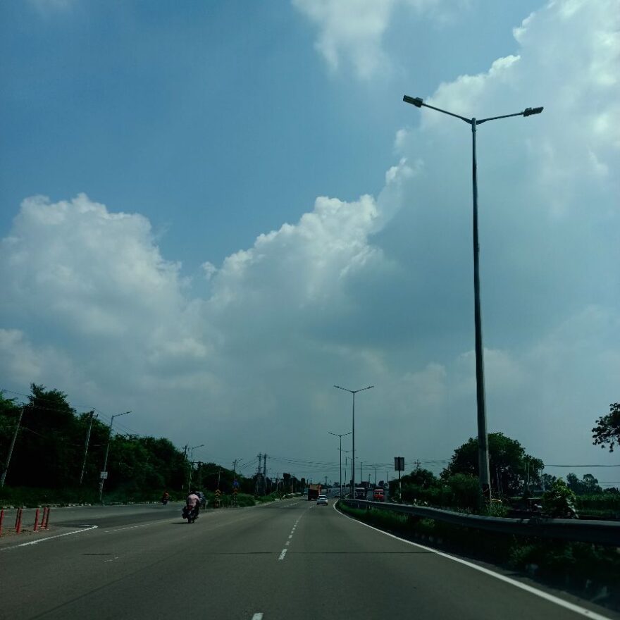 Farmers Basket으로 향하는 길, 푸른 하늘과 쭉 뻗은 도로가 설렘을 더했습니다.