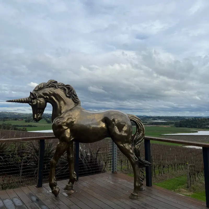 펍 외부, 푸른 하늘 아래 청동 유니콘 조각상이 시선을 사로잡습니다.