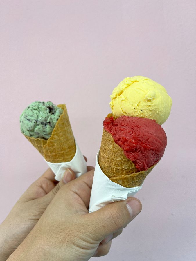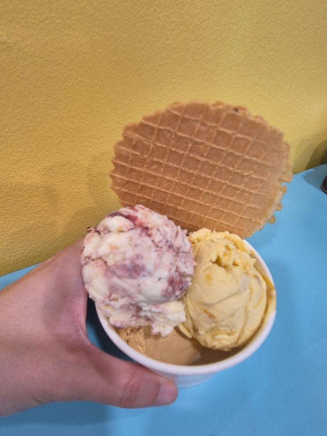 제가 주문한 크렘 브륄레와 땅콩버터 스쿱, 그리고 친구의 쿠키앤크림은 각각 컵과 콘에 담겨 나왔습니다. 2CRÊM의 콘은 직접 만든 수제 콘이라고 했는데, 그 바삭함과 고소함이 아이스크림의 맛을 한층 더 끌어올려 주었습니다. 막 구워낸 듯 따뜻한 기운이 살짝 남아있는 콘의 향이 차가운 아이스크림과 어우러져 환상의 조합을 이뤘습니다.