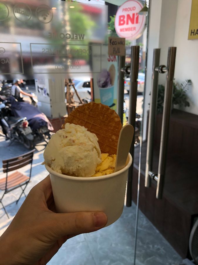 컵에 담긴 아이스크림과 함께 제공되는 바삭한 와플 과자는 또 다른 즐거움을 주었습니다. 둥글고 납작한 형태의 이 과자는 아이스크림을 떠서 함께 먹기에 완벽했습니다. 한입 베어 물면 파사삭 부서지는 경쾌한 소리와 함께 고소한 맛이 아이스크림의 부드러움을 더욱 돋보이게 했습니다. 특히 저는 3스쿱을 시켰는데, 양도 푸짐하고 가격 또한 합리적이어서 가성비까지 완벽한 디저트라는 생각이 들었습니다. 한 스쿱에 4만 동(약 2천 원) 정도 되는 가격은 이곳의 훌륭한 품질을 생각하면 전혀 아깝지 않은 가격이었습니다.