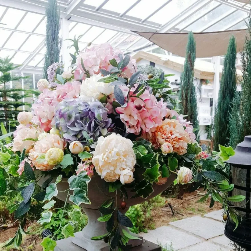 웅천 마리나타워 3층, 엘리베이터 문이 열리는 순간 눈앞에 펼쳐지는 것은 싱그러운 꽃들이 만발한 정원이었다. Image 1에서 보았던 화려한 플라워 장식은 마치 비밀의 화원에 들어선 듯한 착각을 불러일으켰다. 은은한 조명 아래 파스텔톤 꽃잎들이 겹겹이 쌓여 만들어내는 부드러운 색감은 레스토랑에 대한 기대감을 한껏 고조시켰다.