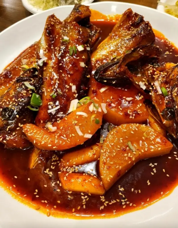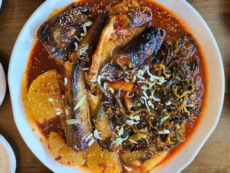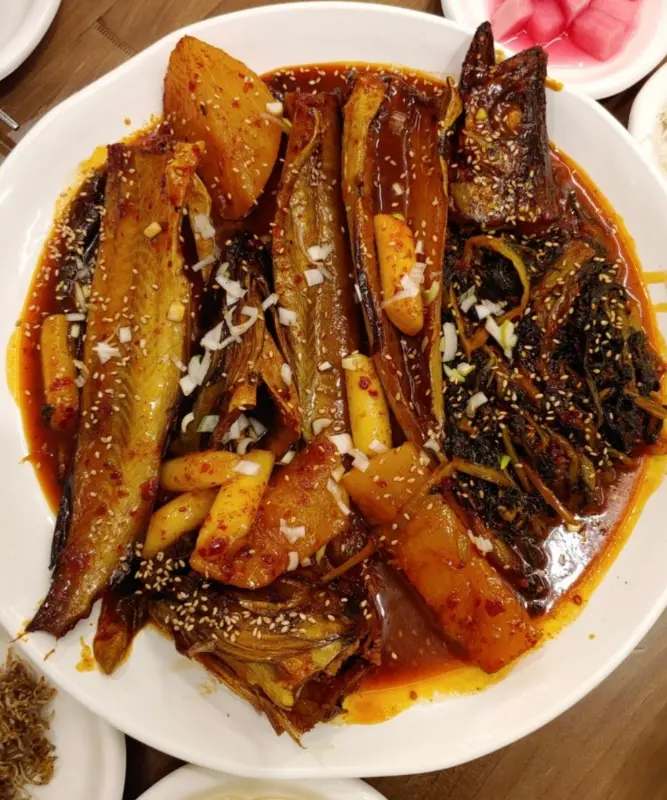 메인 메뉴는 단연 시래기 코다리찜이었다. 4인 기준으로 주문하니 푸짐한 양에 놀랐다. 윤기가 흐르는 코다리 위로 듬뿍 올려진 시래기는 보기만 해도 군침이 돌았다. 젓가락으로 코다리 살을 발라 따뜻한 밥 위에 얹어 먹으니, 매콤하면서도 달콤한 양념이 입안 가득 퍼졌다. 특히 시래기는 코다리 양념과 어우러져 깊고 풍부한 맛을 더했다.
