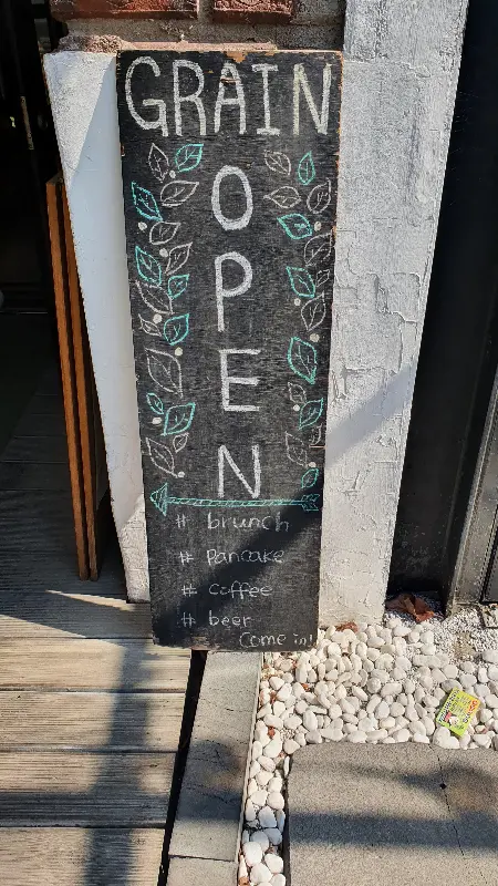 햇살 좋은 어느 날, 브런치를 즐기기 위해 연남동으로 향했다. 오늘의 목적지는 바로 Grain Cafe. 좁은 골목길을 따라 걷다 보니, 아담하면서도 세련된 외관이 눈에 띄었다. 마치 작은 유럽의 카페에 온 듯한 느낌이랄까. 검은색 입간판에는 흰 글씨로 “GRAIN OPEN”이라고 적혀 있었고, 그 아래 작은 글씨로 brunch, pancake, coffee, beer라고 쓰여 있었다. 푸른 잎사귀 그림이 곁들여져 싱그러움을 더했다.