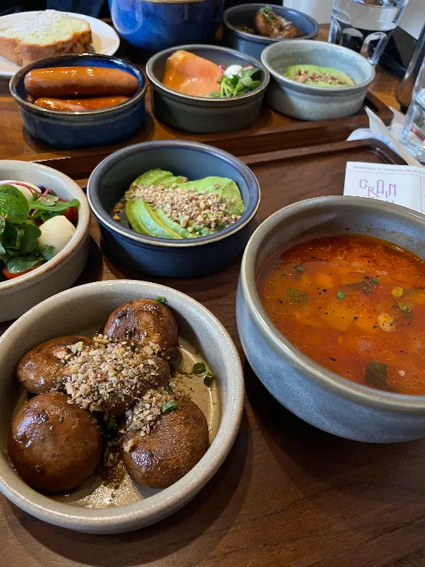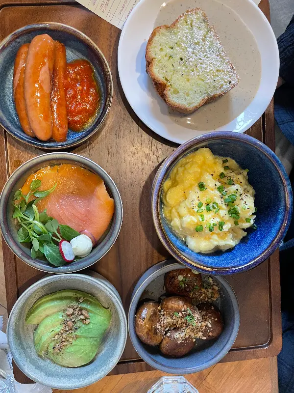 드디어 주문한 메뉴가 나왔다. 나무 트레이 위에 예쁘게 담겨 나온 브런치 플레이트는 마치 예술 작품 같았다. 내가 선택한 메뉴는 토마토 보리 수프, 스크램블, 아보카도, 그리고 로스트 버섯이었다. 하나하나 정성이 느껴지는 비주얼에 감탄했다.