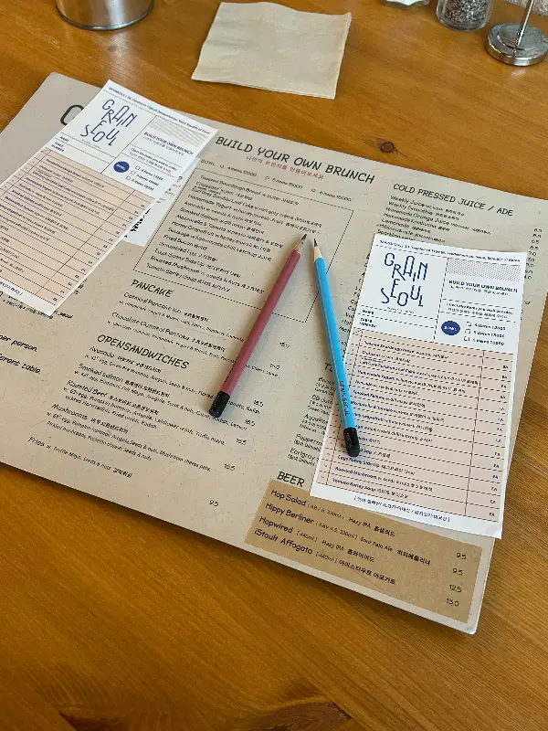문을 열고 들어서니, 아늑한 분위기가 물씬 풍겼다. 은은한 조명 아래, 테이블마다 놓인 꽃들이 공간을 더욱 화사하게 만들어 주었다. 외국인 손님들이 꽤 많았는데, 마치 해외여행을 온 듯한 기분까지 들었다. 메뉴판을 받아 들고 보니, 다양한 브런치 메뉴들이 눈에 띄었다. 이곳의 가장 큰 매력은 바로 ‘나만의 브런치’를 만들 수 있다는 점! 4가지 또는 6가지 메뉴를 선택하여 나만의 플레이트를 구성할 수 있다. 홈메이드 요거트, 스크램블, 로스트 버섯 등 맛있어 보이는 메뉴들이 너무 많아서 고민이 되었다. 마치 보물찾기라도 하는 듯, 신중하게 메뉴를 골랐다.