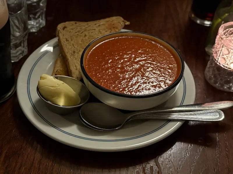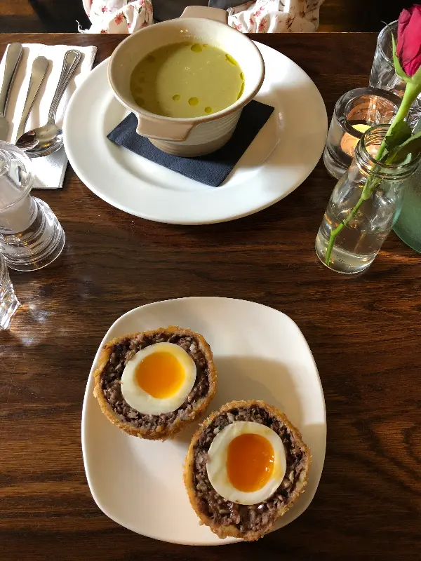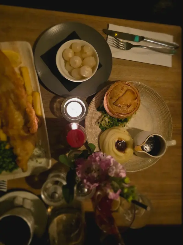 이곳에서는 피쉬 앤 칩스 외에도 다양한 메뉴를 맛볼 수 있습니다. 특히, 스타터로 주문한 스카치 에그는 정말 훌륭했습니다. 겉은 바삭하고 속은 촉촉한 계란과 고기의 조화는 환상적이었고, 함께 제공된 소스와 곁들여 먹으니 더욱 풍성한 맛을 느낄 수 있었습니다. 또한, 오늘의 수프는 밍밍하다는 평이 있었지만, 전체적으로 음식의 퀄리티는 가격 대비 훌륭하다고 생각합니다.
