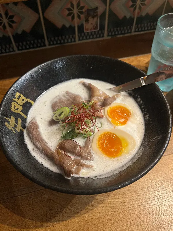 드디어 모습을 드러낸 와규 라멘은, 강렬한 붉은색 국물과 윤기가 흐르는 와규의 조화가 시각적으로도 압도적이었다. 검은색 라멘 그릇에 담겨져 나오는 모습은 더욱 먹음직스러웠고, 한 가운데 자리 잡은 반숙 계란은 완벽한 균형을 이루었다. 얇게 슬라이스된 와규는 마치 꽃잎처럼 겹쳐져 있었고, 그 위에는 신선한 쪽파가 살짝 뿌려져 있었다.