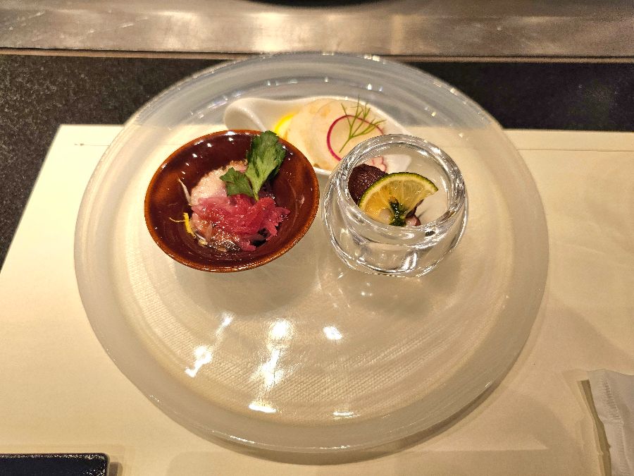 자리에 앉아 잠시 후, 첫 번째 요리인 전채요리가 투명하고 아름다운 접시에 담겨 등장합니다. 마치 보석함처럼 정갈하게 놓인 작은 그릇들 속에는 신선한 재료들로 만든 다채로운 요리들이 담겨 있습니다. 붉은 빛깔의 육회와 상큼한 드레싱의 샐러드, 그리고 레몬 슬라이스로 마무리된 해산물 요리까지, 각 재료의 신선함과 셰프의 섬세한 손길이 느껴지는 완벽한 시작이었습니다. 이는 앞으로 펼쳐질 미식의 향연을 예고하는 듯, 입안을 부드럽게 감돌며 식욕을 한껏 돋우어 줍니다.