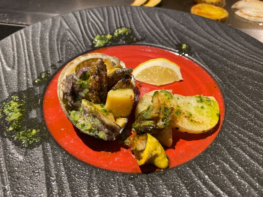 전채요리를 맛보는 동안, 우리의 전담 셰프가 철판 앞에 섭니다. ‘잘생긴 철판 장인’이라는 수식어가 아깝지 않은 셰프는 능숙한 손길로 각종 해산물을 철판 위로 올립니다. 먼저 커다란 랍스터가 푸른 채소와 함께 신선한 자태를 뽐내며 등장하고, 이어서 오돌토돌한 무늬가 선명한 전복이 눈길을 사로잡습니다. 셰프의 유쾌한 입담과 함께 철판 위에서는 신선한 새우와 흰살생선이 지글거리는 소리를 내며 익어갑니다. 버터가 녹아내리는 소리, 해산물이 익어가는 고소한 향이 코끝을 간지럽히며, 시각과 청각, 후각을 동시에 자극합니다.