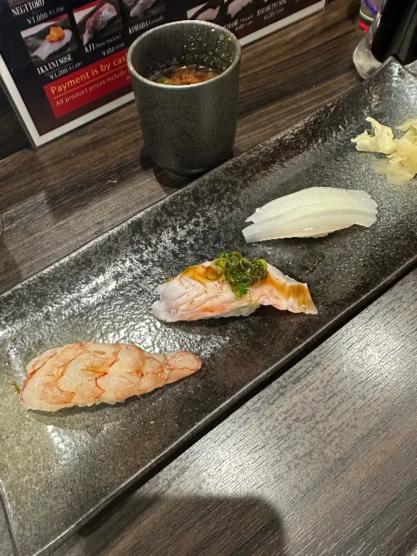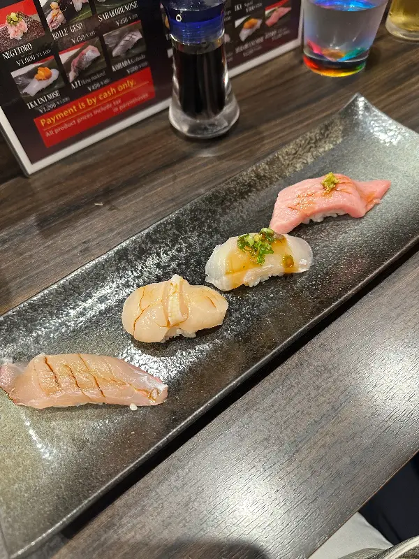 자리에 앉자마자 메뉴판이 눈에 들어왔다. ‘Today’s Omakase Nigiri 10 pieces ¥6,000’ 라는 문구가 시선을 사로잡았다. 다양한 종류의 니기리 스시 사진들은 하나하나 예술 작품처럼 보였다. 참치, 연어, 성게알 등 신선한 재료들이 정갈하게 놓여 있는 모습은 보는 것만으로도 행복감을 선사했다.