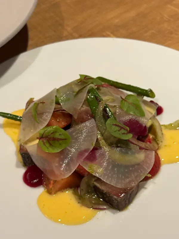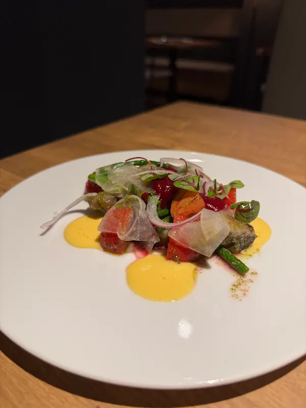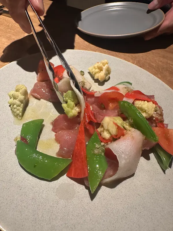 주문한 요리가 하나씩 테이블 위에 놓일 때마다 감탄사가 절로 나왔습니다. Image 1을 보면, 형형색색의 채소와 신선한 해산물이 조화롭게 어우러진 샐러드는 마치 한 폭의 그림 같았습니다. 핀셋으로 섬세하게 플레이팅하는 모습에서 요리에 대한 셰프의 열정과 정성을 느낄 수 있었습니다.