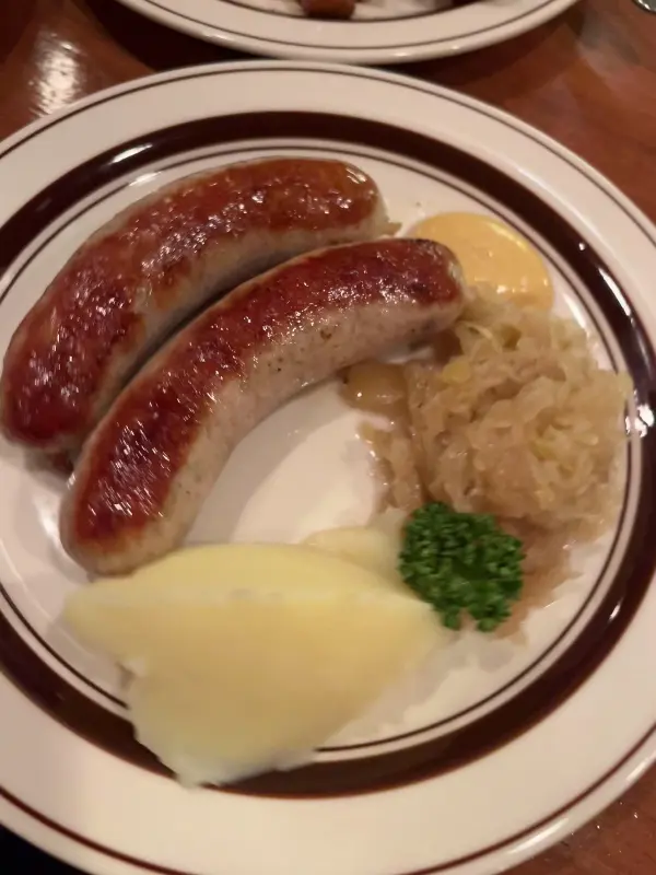 맥주와 함께 곁들일 요리로는 슈니첼과 소시지를 선택했습니다. 먼저 나온 슈니첼은 겉은 바삭하고 속은 촉촉한, 완벽한 조화를 이루었습니다. 레몬즙을 살짝 뿌려 먹으니, 느끼함은 사라지고 상큼함이 더해져 더욱 맛있었습니다. 곁들여 나온 으깬 감자는 부드러웠지만, 약간 밍밍한 느낌이 있어 아쉬웠습니다. 하지만, 슈니첼 자체의 맛이 훌륭했기에 큰 문제는 되지 않았습니다.