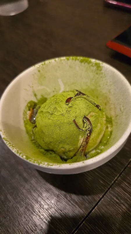 라멘을 다 먹고 난 후에는 말차 아이스크림으로 입가심을 했습니다. 녹차 특유의 쌉싸름한 맛과 달콤함이 조화롭게 어우러져 깔끔하게 마무리할 수 있었습니다. 특히 쌉싸름한 말차 가루가 듬뿍 뿌려져 있어 더욱 만족스러웠습니다.