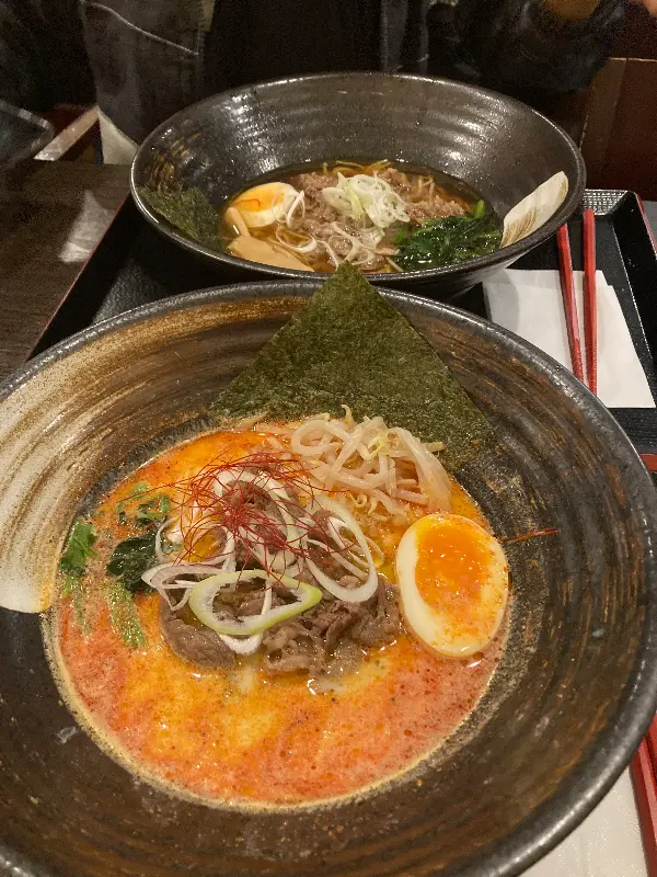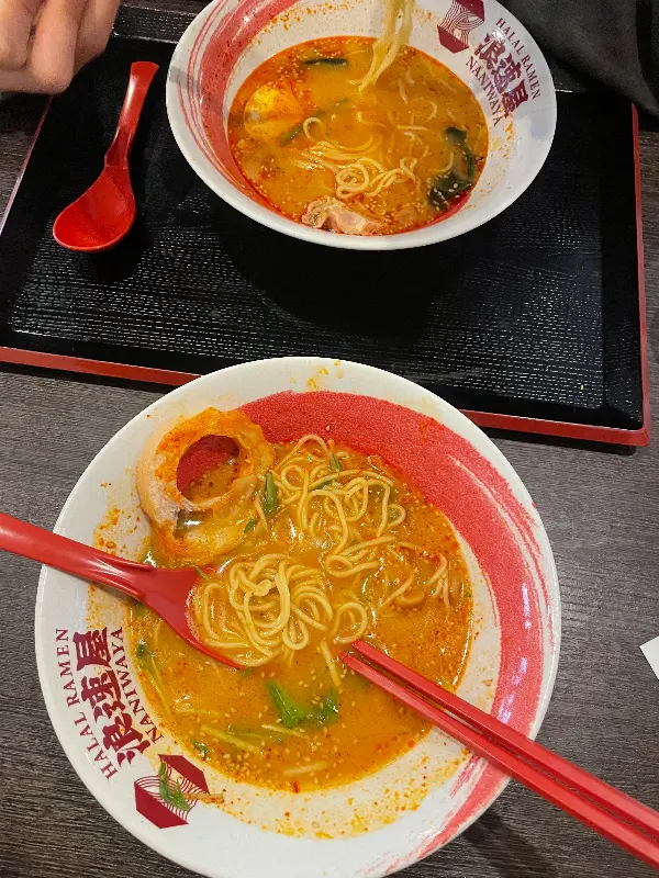 드디어 기다리고 기다리던 할랄 라멘이 나왔습니다. 붉은 빛깔의 국물과 푸짐한 토핑이 시선을 사로잡았습니다. 김 한 장이 툭 얹어져 있고, 그 위에는 윤기가 자르르 흐르는 반숙 계란이 자리 잡고 있었습니다. 젓가락으로 면을 들어 올리니, 탱글탱글한 면발이 국물을 가득 머금고 있었습니다.
