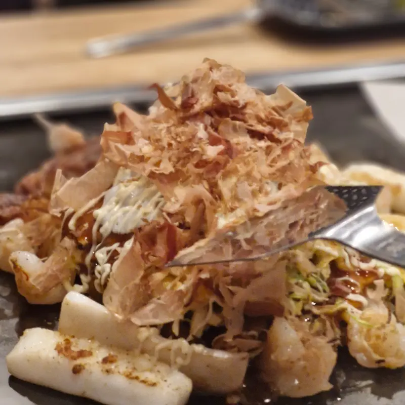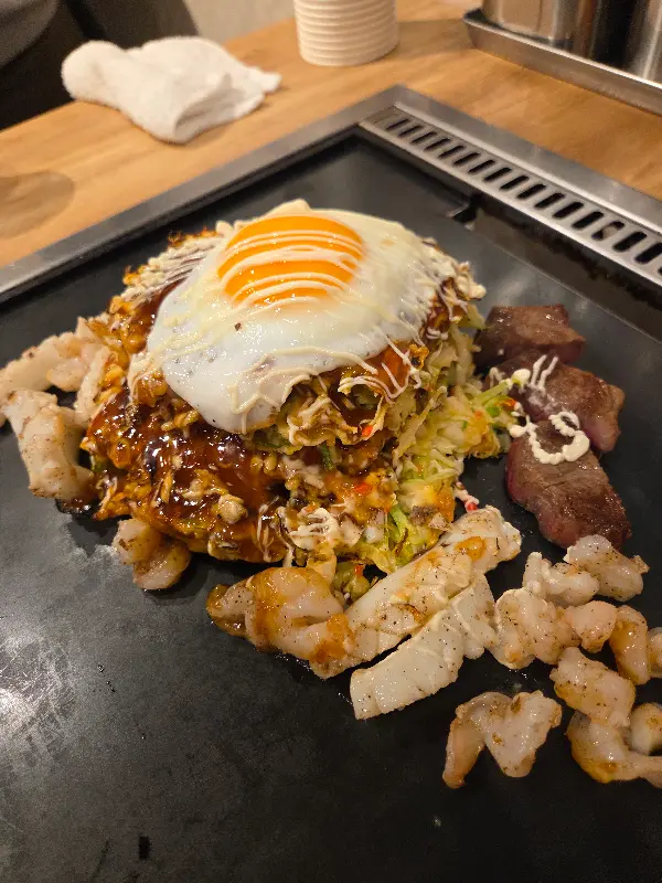 다음으로 맛본 메뉴는 곱창 파 오코노미야끼. 쫄깃한 곱창과 아삭한 파의 식감이 조화롭게 어우러져 풍성한 맛을 자랑했습니다. 특히, 곱창 특유의 고소함이 오코노미야끼의 느끼함을 잡아주어 더욱 맛있게 즐길 수 있었습니다.