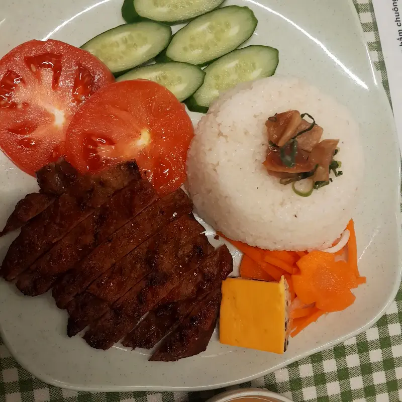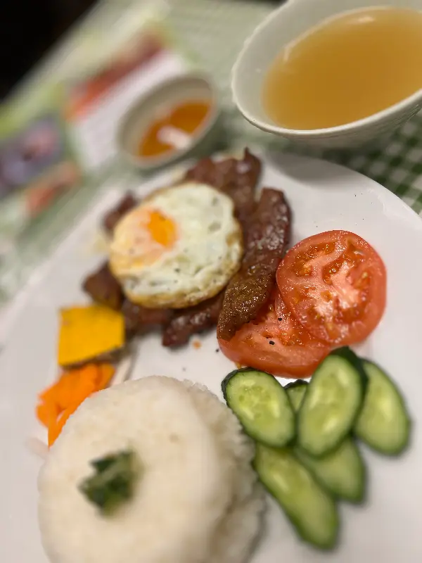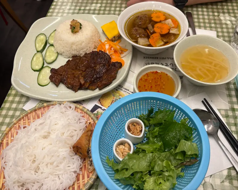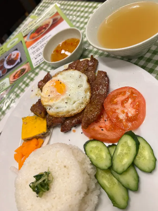 이곳의 대표 메뉴인 콤탐(Cơm Tấm)은 ‘부서진 쌀’이라는 뜻처럼, 砕けた쌀로 지은 밥에 구운 돼지갈비, 계란, 채소 등을 곁들여 먹는 베트남 남부 지방의 대표적인 음식입니다. 한눈에 봐도 먹음직스러운 비주얼은 식욕을 자극합니다.