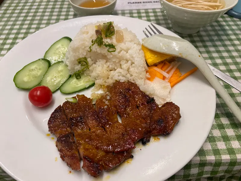 메뉴판은 간결합니다. 볶음밥, 쌀국수, 그리고 콤탐(Cơm Tấm)이라 불리는 ‘브로큰 라이스’가 전부입니다. 하지만 이 소박함 속에 숨겨진 맛은 결코 평범하지 않습니다. 돼지고기를 곁들인 볶음밥을 주문했습니다. 테이블 위에 놓인 순간, 코를 찌르는 향긋한 남부식 양념 냄새가 침샘을 자극합니다.