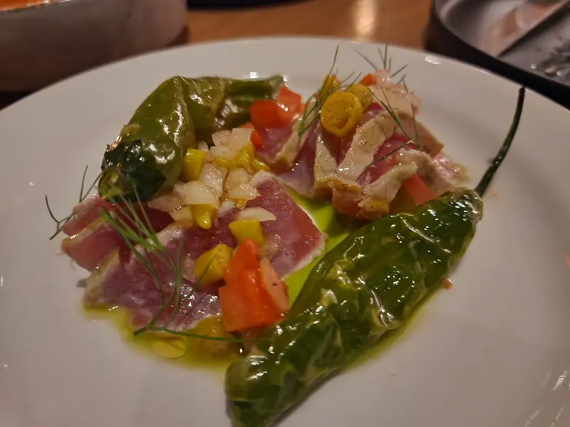 참치 크루도는 신선함이 살아있는 메뉴였습니다. 붉은 참치와 초록색 고추의 색감 대비가 눈을 즐겁게 하고, 입안에서는 신선한 참치의 풍미가 가득했습니다.