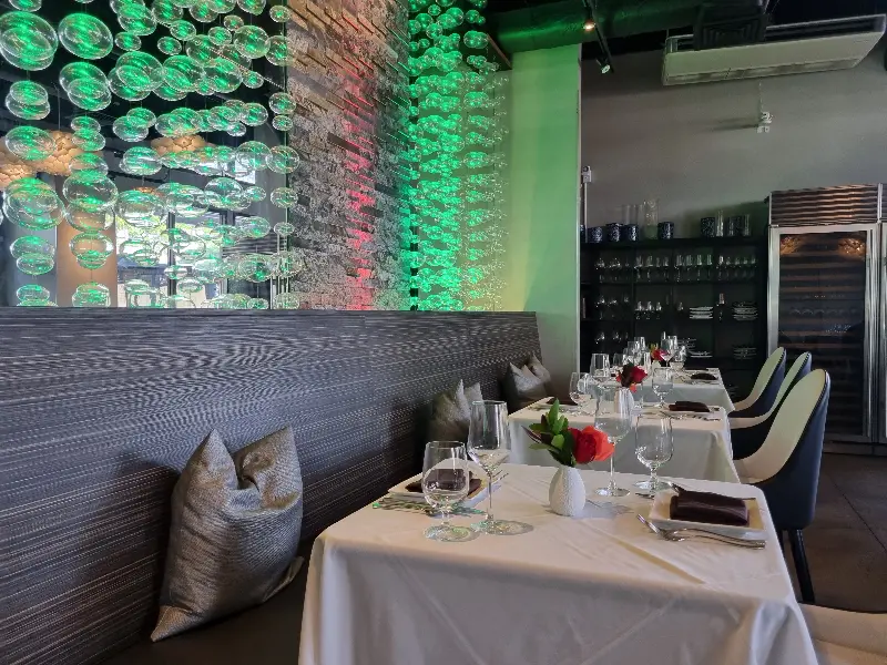 레스토랑 내부는 생각보다 훨씬 넓고 분위기 있었다. 테이블 간 간격도 넓어서 편안하게 식사를 즐길 수 있을 것 같았다. 벽면에 설치된 독특한 예술 작품과 은은한 조명이 고급스러운 분위기를 더했다. 특히 눈에 띄는 것은 천장에 매달린 수많은 유리 장식이었다. 마치 물방울이 떠다니는 듯한 몽환적인 느낌을 자아냈다. 초록색과 붉은색 조명이 더해져 더욱 신비로운 분위기를 연출했다.