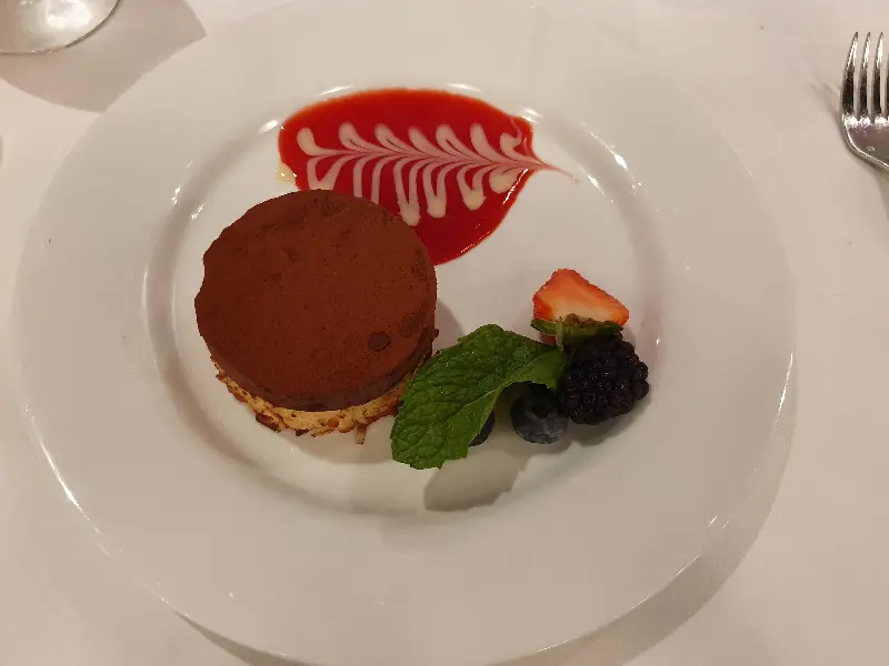 마지막으로 디저트를 주문했다. 둥근 케이크 위에 붉은색 시럽으로 섬세한 장식이 되어 있고, 신선한 딸기와 블루베리가 곁들여져 나왔다. 달콤한 케이크와 상큼한 과일의 조화는 완벽한 마무리였다.