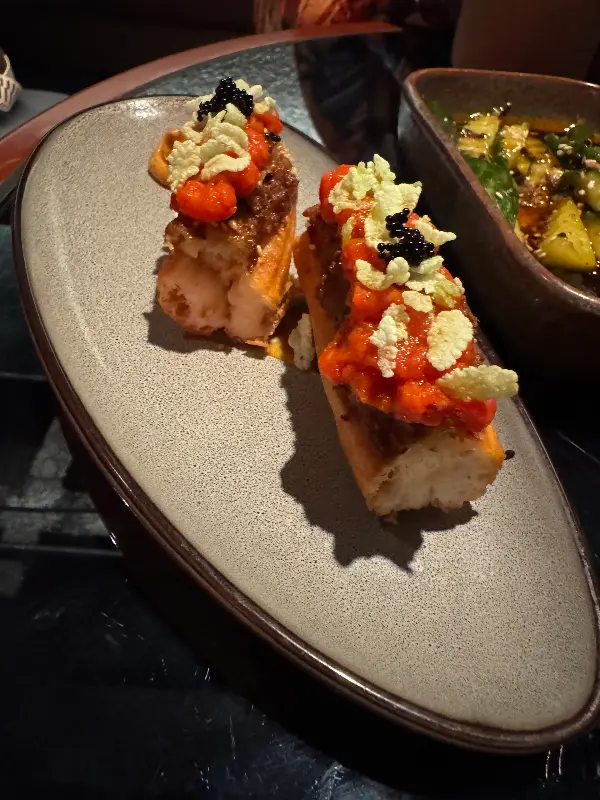 문을 열고 들어선 순간, 나이트 카만의 독특한 분위기에 압도당했다. 편안하면서도 개성 있는 인테리어는 마치 비밀스러운 아지트에 들어온 듯한 느낌을 선사했다. 벽에 걸린 태양 모양의 장식(Image 5)은 은은한 빛을 내뿜으며 공간에 따뜻함을 더했고, 테이블 간 간격도 넓어 편안하게 대화를 나누며 식사를 즐길 수 있었다. 전체적으로 어두운 조명은 테이블 위의 음식과 칵테일에 집중하게 만들었고, 몽환적인 분위기를 연출했다.