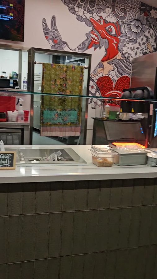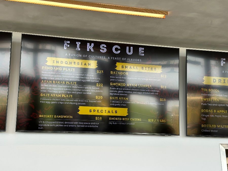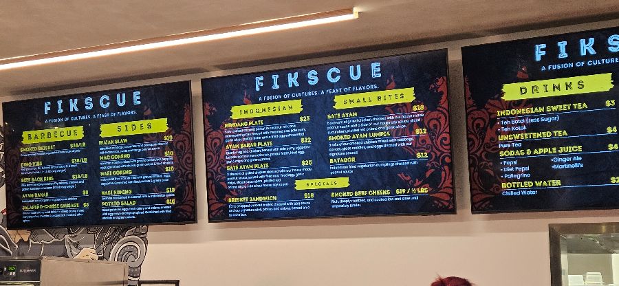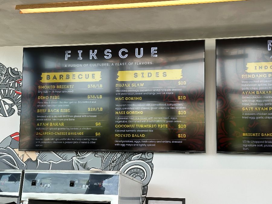 Fikscue에 도착하자, 정면에 보이는 메뉴판이 가장 먼저 눈길을 사로잡습니다. ‘FIKSCUE: A FUSION OF CULTURES. A FEAST OF FLAVORS.’라는 문구처럼 이곳은 단순한 식당이 아닌, 두 문화의 맛이 어우러지는 미식의 향연을 예고하는 듯했습니다. 은은한 조명 아래 깔끔하게 정돈된 주문대는 음식에 대한 기대감을 더욱 높여주었습니다. 벽면에는 인도네시아 전통 문양을 현대적으로 재해석한 듯한 예술적인 그래픽이 그려져 있어, 텍사스 바비큐 전문점에서는 쉽게 볼 수 없는 이색적인 분위기를 자아냈습니다. 마치 동남아시아의 활기찬 시장과 미국의 정통 바비큐 레스토랑이 절묘하게 조화된 듯한 인테리어는 Fikscue만의 독특한 정체성을 명확히 보여주었습니다.