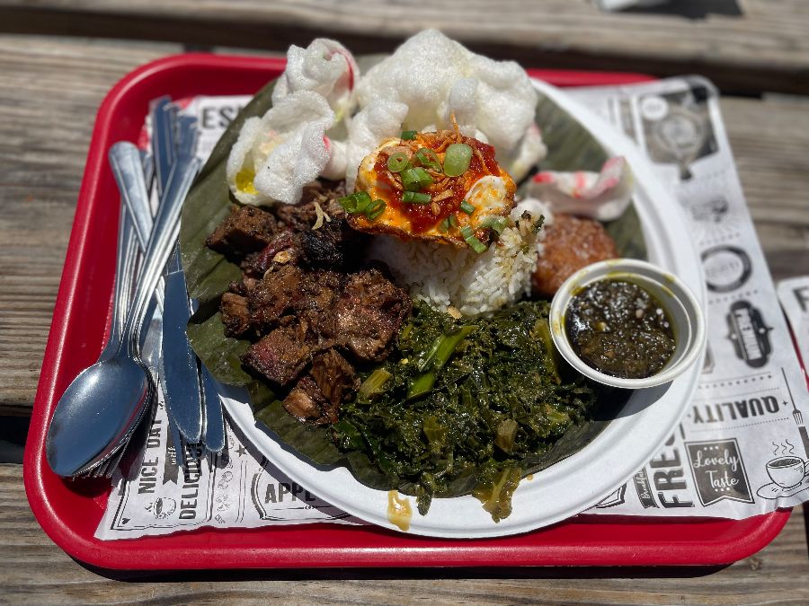 바비큐에 이어 렌당 플레이트를 맛보았습니다. 코코넛 밀크와 인도네시아 향신료로 오랜 시간 조리된 브리스킷은 부드러움을 넘어 입안에서 녹아내리는 듯했습니다. 깊고 진한 향신료의 풍미가 고기 깊숙이 배어들어 이국적인 맛의 절정을 선사했습니다. 함께 나온 스팀 라이스, 케일 곁들인 렌당, 갈릭 칩, 포테이토 프리터, 튀긴 계란, 삼발 소스까지 모든 구성이 완벽한 조화를 이루었습니다.