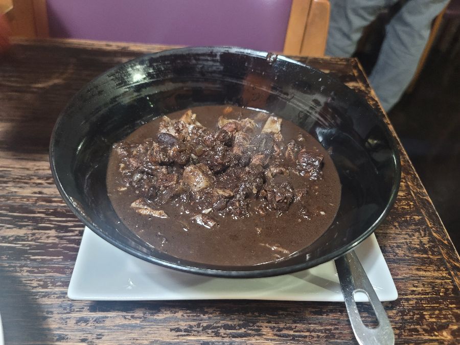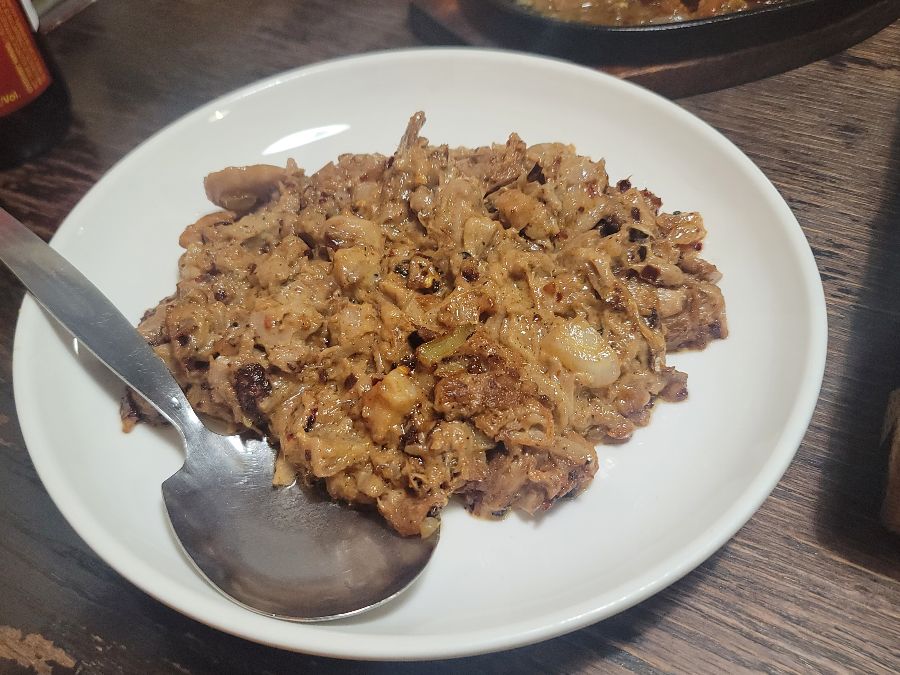 얼마 지나지 않아 주문한 음식들이 하나둘 테이블 위로 올라왔습니다. 먼저 눈길을 사로잡은 것은 짙은 갈색의 스튜였습니다. 아마도 시니건이나 디누구안 같은 필리핀의 대표적인 고기 스튜 중 하나였겠죠. 깊고 진한 향기가 코끝을 스쳤고, 한입 떠먹자마자 새콤하면서도 고소한 돼지고기의 풍미가 입안 가득 퍼졌습니다. 마치 잘 만든 돼지고기 장조림 같은 익숙함 속에 이국적인 향신료의 조화가 어우러져, 낯설지만 강렬한 인상을 남겼습니다. 이 요리는 잊었던 미뢰를 기분 좋게 놀라게 하는 그런 맛이었습니다.